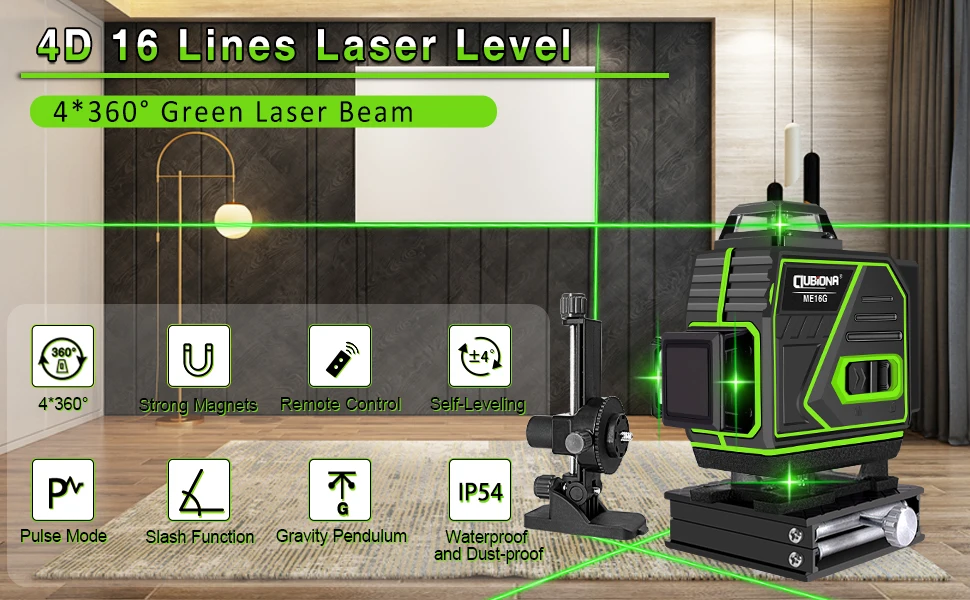 The ME16G 4D green laser level with higher visibility, eye-friendly for all-new experience. Bright green-beam laser up to 2x brighter than standard red beams, which can help to improve your work efficiency.