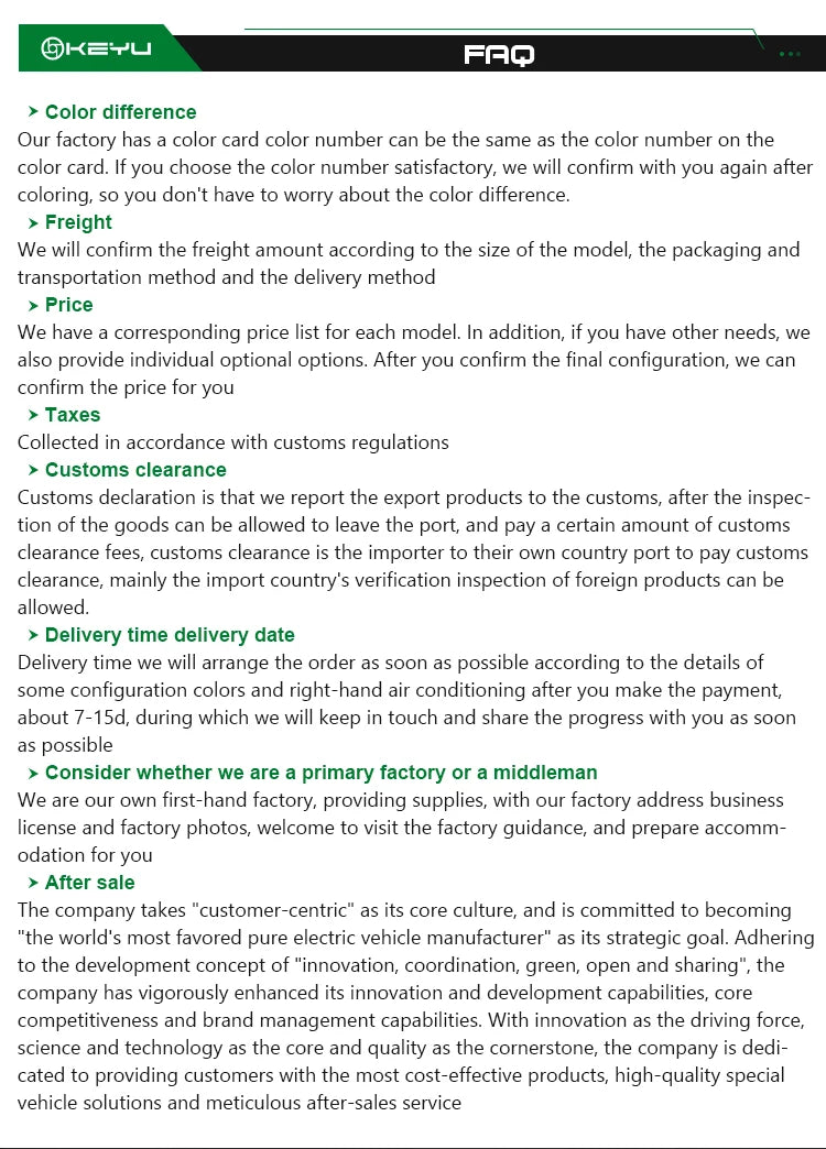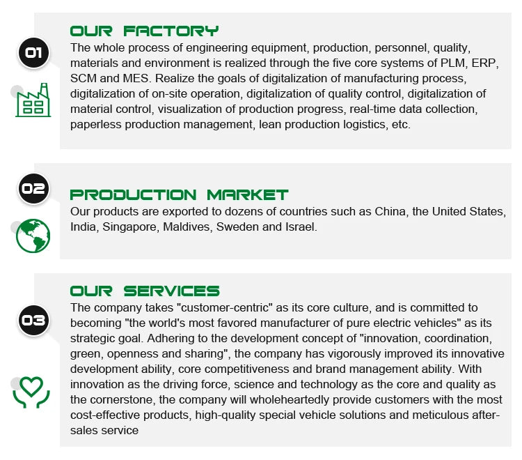 The company is committed to the strategic purpose of becoming a "global high-quality pure electric vehicle manufacturer" and the core corporate culture of "customer-oriented". Adhering to the development concept of "innovation, coordination, green, openness and sharing", we will vigorously enhance the company's innovation and development ability, core competitiveness and brand management ability. Adhere to innovation as the driving force, technology as the core, and quality as the cornerstone, and wholeheartedly provide customers with the most cost-effective products, high-quality special vehicle solutions and meticulous after-sales service.
