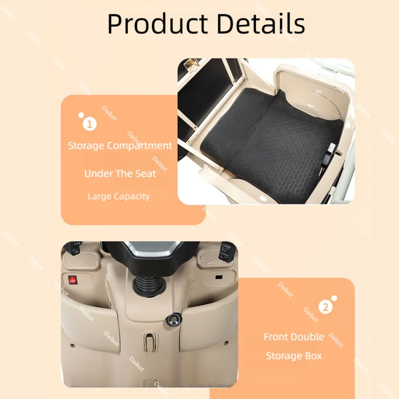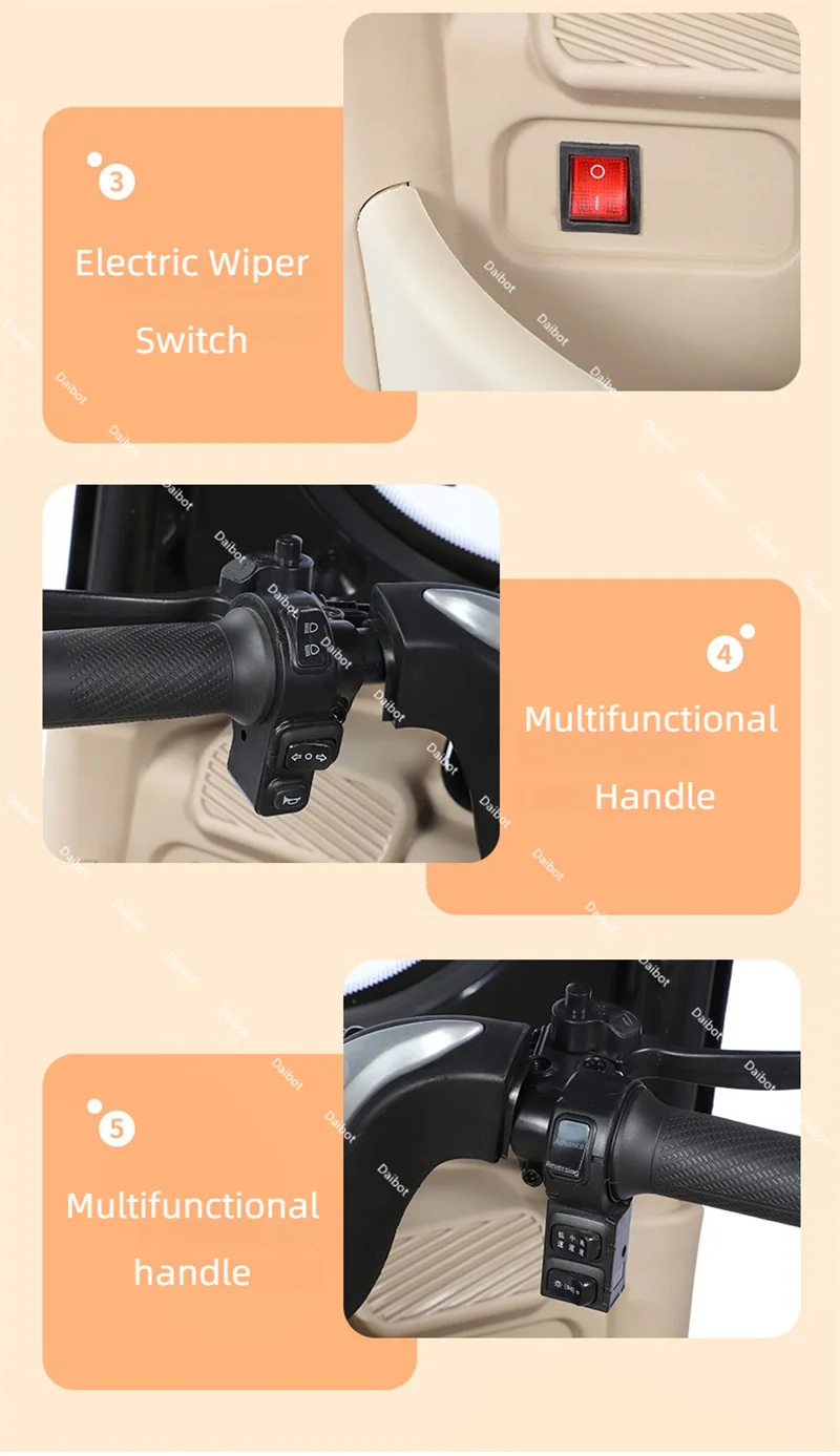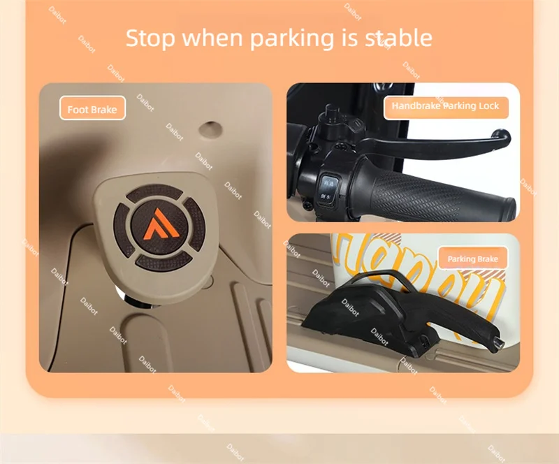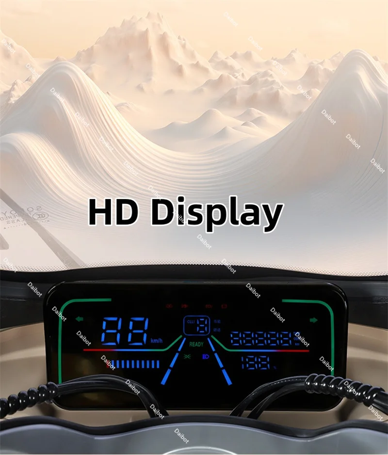 Feature: Handle Brake and Foot Brake System, Hydraulic Shock Suspension System, Electric Wiper,Dual Remote Control Alarm System, Smart LCD Display, LED Headlight, Turn Light, Rear Taillight, Horn, Parking Brake ( keep the scooter in place when parked, especially on steep inclines or declines),  Reverse Function.