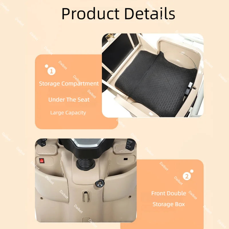 Feature: Handle Brake and Foot Brake System, Hydraulic Shock Suspension System, Electric Wiper,Dual Remote Control Alarm System, Smart LCD Display, LED Headlight, Turn Light, Rear Taillight, Horn, Parking Brake ( keep the scooter in place when parked, especially on steep inclines or declines), Reverse Function.