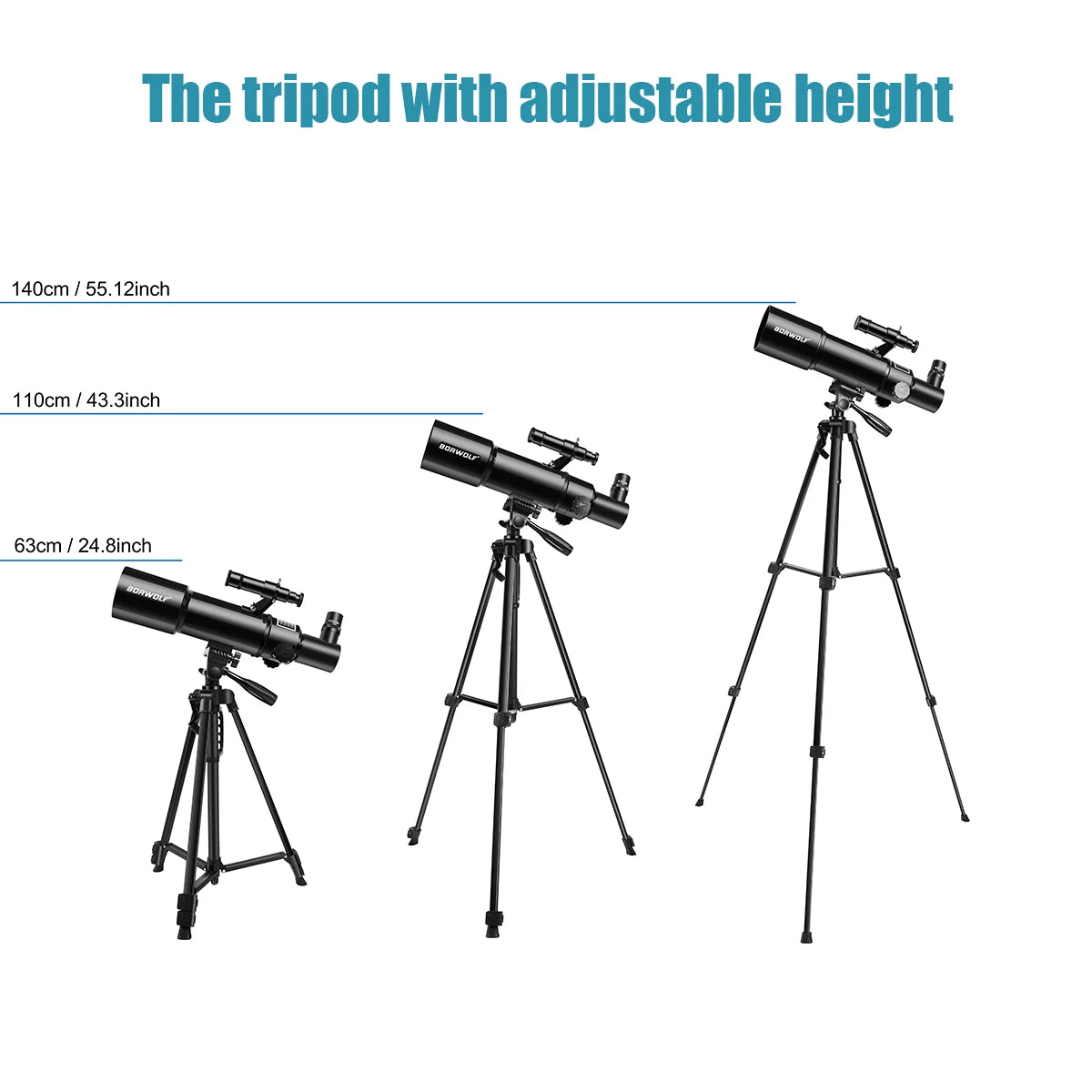 【Adjustable Tripod】:Equipped with an adjustable aluminium tripod, the telescope for adults provides better stability, durability and not easy to shake. The tripod can be adjusted from a height of 20.08" to55.12", providing you with a wide range of viewing angles to suit people of different heights.