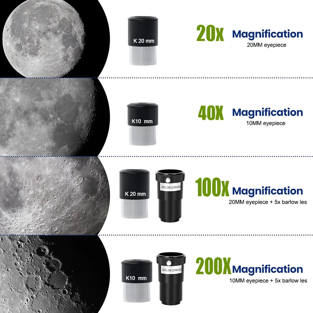 【Professional-Grade Astronomical Telescope】:This astronomical telescope is equipped with two interchangeable eyepieces (10mm and 20mm) and a 5x Barlow lens, delivering a versatile magnification range of 20x to 200x. Additionally, it includes a 5x24 finder scope with a crosshair, making it easy to locate and track celestial objects. This telescope offers exceptional versatility and enhanced viewing experiences, catering to both beginners and astronomy enthusiasts alike.
