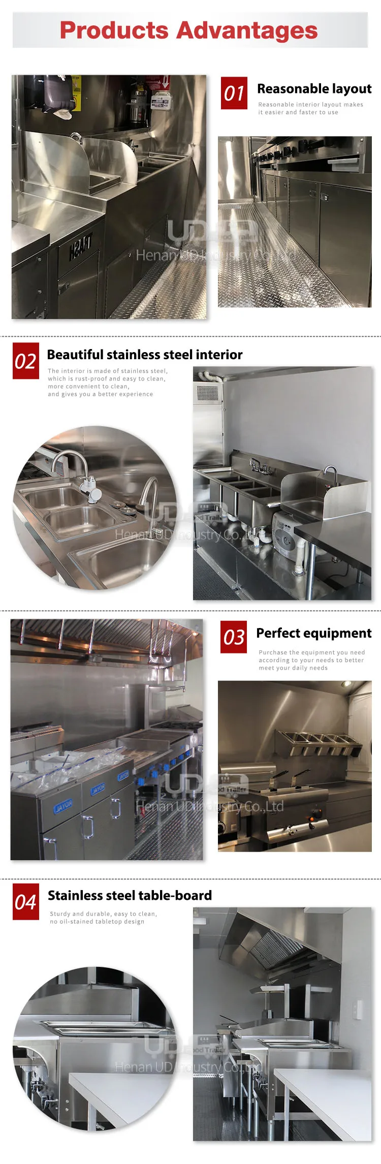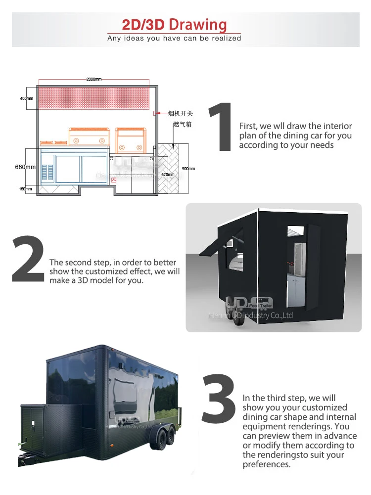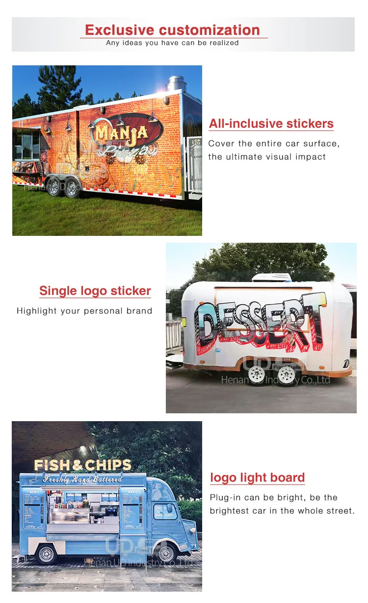 Multifunction: as a food trailer, as a mobile shop, as a flower shop, as a fruit shop, it just depend on interior equipment.Choose food equipment according to your requirements, we will install it for you for free.
