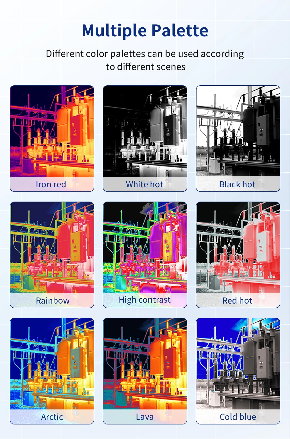Supports visible light fusion, single infrared or single visible light and other imaging modes, 9 color palettes
