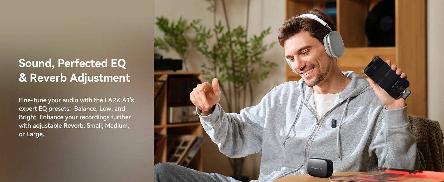● Customizable Sound with EQ & Reverb: Fine-tune audio with LARK A1 wireless microphone’s 3 EQ presets (Balance/Low/Bright) + 3 Reverb modes (Small/Medium/Large). Sculpt clarity, depth, and texture—ideal for podcasters, ASMR creators, and filmmakers using a studio-grade mini mic.