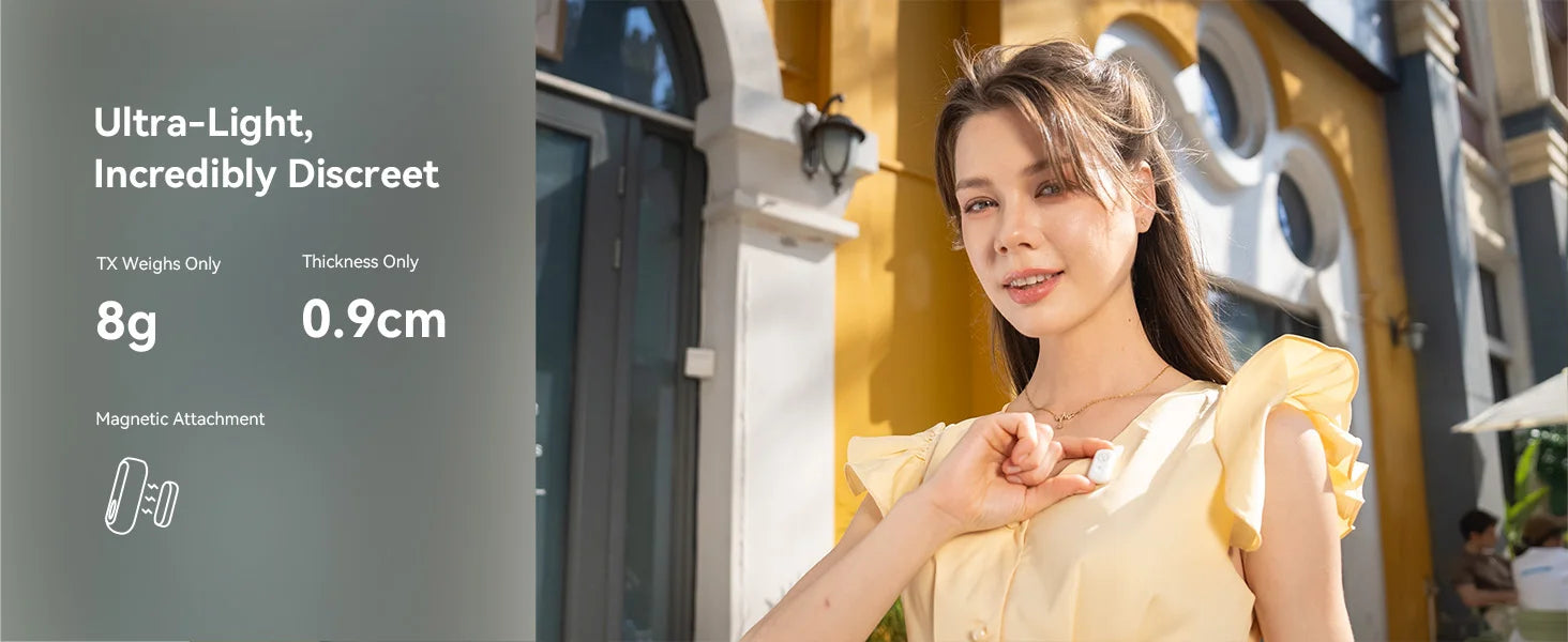 ● Ultra-Light Magnetic Mic: At 8g and 9mm thick, this discreet wireless microphone attaches magnetically to collars, hats, or hidden spots—no bulk, just cinematic sound.