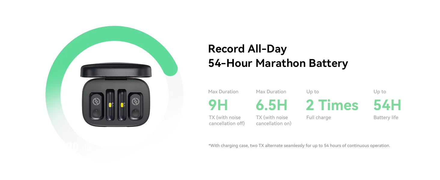 ● Up to 54h Battery Life: Achieve up to 54h using one transmitter (TX) alternately with the charging case—ideal for long shooting days without battery anxiety.