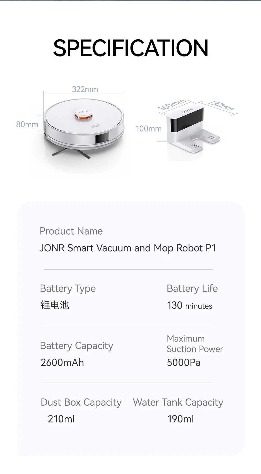JONR P1 Robot Vacuum Cleaner Intelligent Automatic Home Cleaning System Suction Power Mopping Floor Robot for Houses