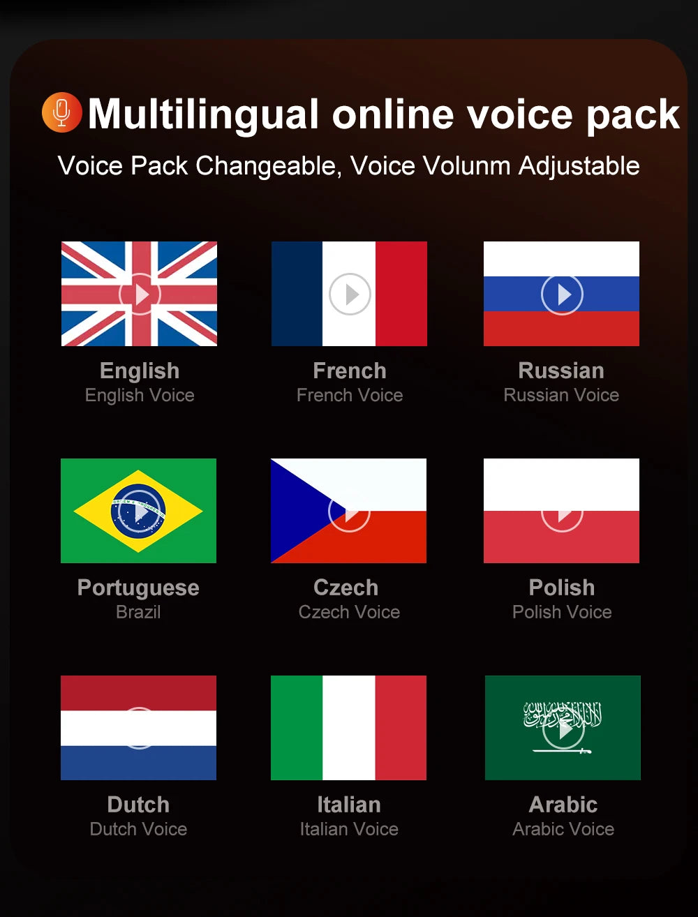 16. Multilingual Voice Packs & Adjustable Volume