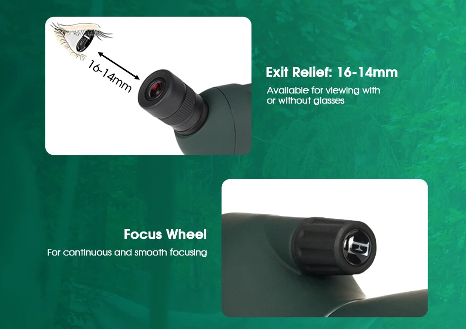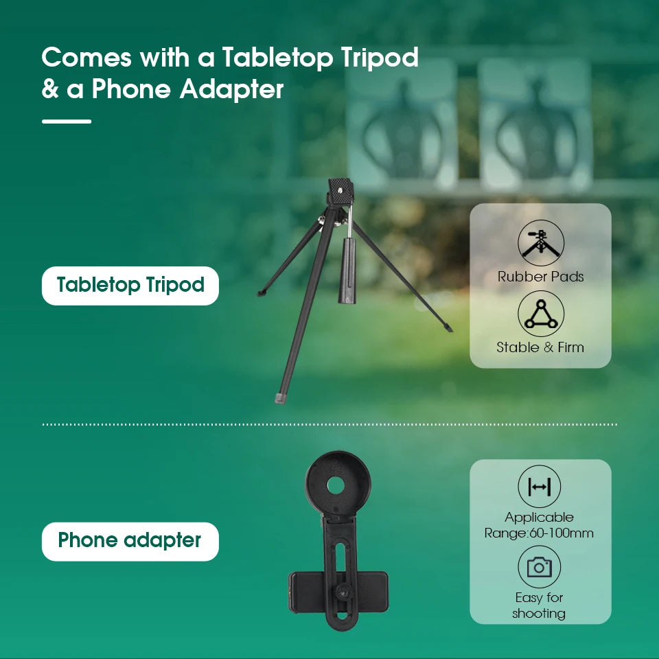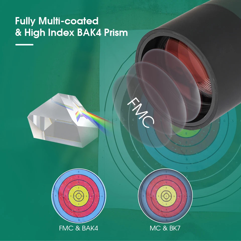 More powerful light gathering ability;70mm tube allows plenty of light and decent view of the target once set;extendable sunshade built onto the main barrel to reduce glare.FMC BAK4 prism allows more light to enter the objective lens, providing you with clearer and brighter images.Fold down eyecupsPortable desktop tripodThe desktop tripod is lightweight and can be carried in a backpack at any time, making it an ideal bird watching partner.